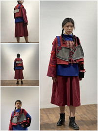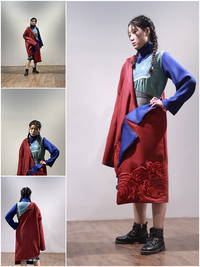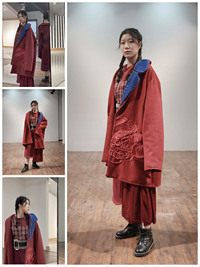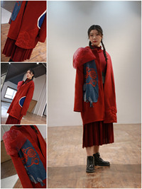 图案以中国传统醒狮主,“醒”对于我们的意味着觉醒与传承,中国元素是我们无法舍弃且有责任传承的文化,发掘我们文化长河的每一处,把看似老旧的东西,换汤不换药的呈现给世界。使中国文化元素流传到每一代人的日常生活中。在醒狮的传统元素上又添加了现代时尚化的风格。让设计回归中国,体现中国的风味。毛呢和纱织面料给人成熟稳重的设计感,薄纱的轻盈让稳重中不失优雅与放松,毛呢外套休闲风,是成熟稳重的代表,搭配纱织感裙两种不同的搭配大胆中和,刚柔并济,且又不失时尚稳重大气职业的风格。