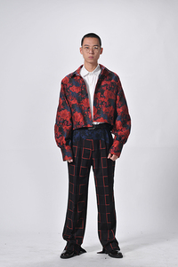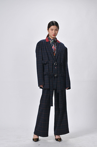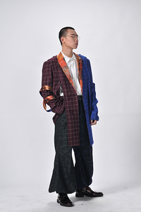 整个系列的款式设计大体以不对称的廓型为主,运用分割拼接的手法,以传统西装作为基底,提花纹面料与经典格纹面料的拼接搭配,融入对比款式。服装中心运用对比色彩面料,展现视觉冲击。让人心灵震撼,不受拘谨。