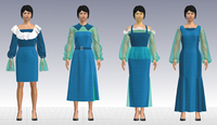 款式三:一字领灯笼袖连着及踝鱼尾拼接打褶湖蓝色纱裙。外罩背带湖蓝色丝绒面料拼接打褶湖蓝色纱。适用场合为商务晚宴。