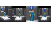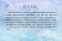 主题为西学东渐。中式面料西式剪裁,回纹织锦缎面料为主面料,水晶缎、湖蓝色纱、镂空深蓝色网纱。西式剪裁:大翻领,斜裁抽褶,A字版型以及鱼尾裙。