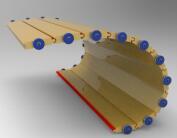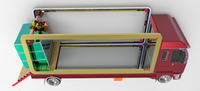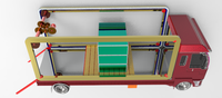 为了帮助普通货车弥补上述不足,我们设计了一款卷帘门,既可以作为后车门又可辅助装卸运输货物的装置。我们设计思路是卷帘门由一块块承载板通过销连接,使其能自由弯曲,外侧加有滑轮可实现卷帘门在轨道内运动。车后方我们添加了一对导杆,方便实现卷帘门的下滑。这款设计可以实现货物运输以及不需要人工关车门,当货物需要从底部搬运至车厢内,我们只需要将后置导杆打下,让卷帘门自动下滑,通过人工或搬运装置将货物搬运到卷帘门上,让卷帘门带动货物移动到车厢内部。当货物装在完毕,使卷帘门置于车厢后形成车门。由电机驱动控制,达到卷帘门运动的目的,解决搬运难,装卸累等问题。
