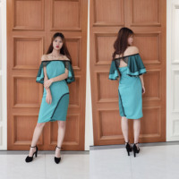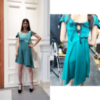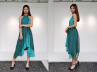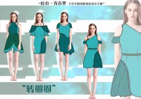 本系列作品整体使用沉稳的墨绿色为基础色调,或深或浅的变化加深分割线的存在,加强了轮廓的对比感。布料也有垂感和舒适的手感,非常适合穿着于商务型的交流场所,衬托高贵的气质,达到优雅而美。本系列设计元素包括:相同的弧形曲线分割元素,简约的珍珠点缀,走路时飘逸而动的袖边裙摆,和经久不衰的不对称的时尚效果等等。本系列的套装对上半身的肩颈进行反复设计,希望展露出女性因自信而挺立的肩部与颈部。本系列套装都采用x型廓形和A字裙型,不规则的裙摆,若隐若现的轻纱,还有不对称的波浪裙元素都增加了趣味性和神秘感。