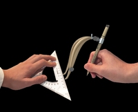 本发明涉及一种直尺绘直线时防止拖墨及粘墨的辅助器,此产品运用pvc及硅胶材料设计,将直尺与绘笔拉开固定距离以防止拖墨及墨粘到尺子上造成二次污损的问题出现,通过此产品绘出与尺子平行的直线。也可变形后绘制圆线,可广泛应用于针管笔、毛笔、马克笔等。