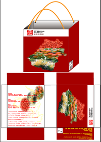 外包装样式采用手提袋,用四分之三红色与白色相互比较。独特的logo印在左上角开局醒目,和一目了然的“巨鹿特产”四个字成为一体。红色部分印有巨鹿县地图,能让人清晰的意识到巨鹿县的形状,形状里面带有枸杞、金银花、串枝红杏三种最具代表性独特性的特产实物图,侧面印有枸杞、金银花、串枝红杏的介绍,采用醒目的黄色与红色对应,形成鲜明对比。背面有特产详细介绍与巨鹿县介绍,还印有古黄河图,因为巨鹿县地处古黄河漳河冲击平原 ,所以我添加了这个元素。外加三种特产实物图辅助,种种元素创意融合这才形成了外包装手提带。