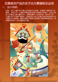 作品名称:巨鹿县农产品历史文化元素提取及运用 学校名称:宿迁学院 参赛队伍:宿迁学院房菊 参赛学生:房菊 指导老师:徐明