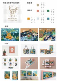 此作品是根据巨鹿县旅游文化所创作的品牌形象设计logo及其插画,及一些文创产品和包装。此品牌设计来体现巨鹿县旅游文化的地方特色,品牌logo图形提炼了巨鹿的形象和几何图形,繁简结合线面结合,色彩使用金色使品牌名称和特色相呼应,金色与旅游文化结合更能体现旅游文化的丰厚内涵,文化所带来的财富和荣耀。三幅插画内容分别体现了中国巨鹿红杏商务节,中国金银花旅游文化节和杏花旅游文化节。画面使用超自然手法体现人与自然的和谐共处,互惠互利,使旅游文化带动当地经济繁荣。通过旅游来挖掘中国传统文化,了解和体验中国传统文化,从而增进文化交流,传播中国文化,彰显文化自信。