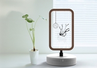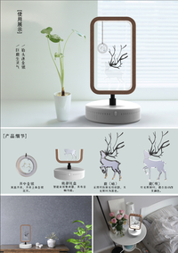 本产品是一个为巨鹿设计的旅游文创纪念品,设计灵感来源于巨鹿当地的特色农作物(金银花)、巨鹿县名以及我国的神话故事(嫦娥奔月)三者为灵感。这是一个音响与床头伴睡灯结合在一起的智能电器,灯具的中间有一只小鹿正在抬头望月,在月亮中间镌刻有一朵金银花,象征着金银花在巨鹿的作用。