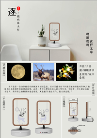 本产品名称叫做逐——鹿鸣床头灯,“逐”来源于嫦娥奔月以及巨鹿县附近发生的巨鹿之战,“鸣”又同“明”;在本产品中间有一只鹿正在抬起头仰望上方,鹿自古就是灵气的象征,在灯的上方有一个月亮,月亮在古代则是人们精神寄托的美好事物,月亮中间还镌刻着一朵金银花。鹿、月亮、金银花三者构成一个整体,所谓巨鹿生灵气,抬头逐金银,这个灯象征着巨鹿县人民对美好生活的向往和追求,灯的作用是提供照明,鹿鸣又叫鹿明,表示巨鹿县的光明前途。