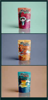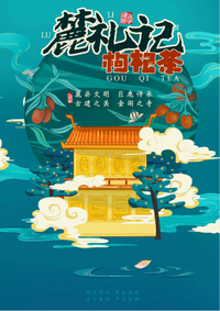 《麓礼记》——枸杞茶:运用了蓝绿的冷色调,结合当地特色景点金阁寺,体现了”古建之美"。金阁寺前的松树也契合了"巨鹿传承"代代相传的主题。金阁寺后的枸杞与产品形成呼应。