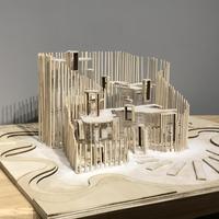 建筑模型制作选择运用U胶、热熔胶、3MM木板、3MM亚克力板、树粉以及砂纸进行制作。利用软件将模型进行造型制作,满足前期灵感塑造,创建好软件模型后将模型转为CAD,方便板材切割,由于每个面都有不同的角度长短,要将每个面的长短大小尺寸一一不差的对量出来,绘制成CAD,角度尺寸如有一点差距,在制作模型的时候都会影响整体效果。在建筑模型的制作中,首先,先用雕刻机将模型的零件进行雕刻,将雕刻完之后的木板和亚克力板进行砂纸酒精擦拭。其次,使用胶枪将小木条立在底座上,进一步深化模型零件组件。将模型零件中的木板和亚克力板进行拼装,拼装过程中木板与木板之间,木板与亚克力之间使用U胶,小木条使用胶枪进行粘住。最后,围绕建筑体外观进行灯光缠绕,使之建筑整体发亮。将白色草粉用手拈开撒入建筑周围以及建筑屋顶,由实到虚,营造雪天。建筑风格的确立,体现历史的传承和现代文明的发展。建筑是城市环境的主要组成部分,是我们生存的基础。舒适的生活是我们更高的追求。本次设计作品主要体现现代人们的生活,讲求现代融入自然。以数幢多种功能的建筑组织而成的相似共同体,多个建筑之间相互协调、互为补充,形成不可分割的统一体。