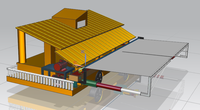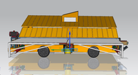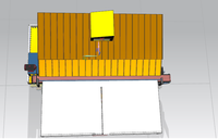 当机器启动后驶到预定位置后,震树装置利用液压臂推送与树干贴紧准备晃树。随后,树后果实收集器向前推进,树后收集装置由帆布、帆布收放器及抻布杆组成。帆布收放器进行放布,同时抻布杆利用液压臂向前推带领帆布绕过书到树后进行果实收集,树前利用采收机机身顶棚进行收集,树前收集装置与树后收集装置呈V行设计,并在底部设有输送带。待树后收集器申放完成后,启动晃树电机,利用偏心轮旋转振动进行晃树,晃落的果实沿收集装置滚落至输送带,再利用输送带同意送至袋或箱中,在输送带尾部设有鼓风机,将所果实一起下落的枯叶吹走,达到果叶分离,使收集到的果实更干净。采收果实完成后帆布收放器收回帆布,晃树装置收回原位进行下一棵树的采收工作。