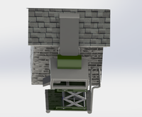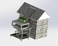 在除雪机工作时,由伸缩装置,即液压杆将光滑材质沿屋顶积雪下方送至屋脊处,由于雪自身的重力以及光滑材料的光滑材质,光滑材料上方积雪沿光滑材质轨道落于引导装置中。引导装置将雪偏移至除雪机的后方,以免堵塞除雪机。行走装置控制除雪机前进后退,并于伸缩装置成一体,控制着伸缩装置的前进后退。
