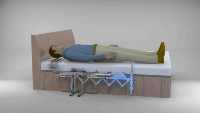 所研制的起床辅助器可以通过模仿护理人员将难以起床的老人从床上抱起的动作,从而实现人性化且高程度的辅助起床困难老人病人从床上坐起以及上下床。起床时一号电动推杆带动四连杆实现主机从折叠态变为工作态,通过步进电机带动丝杆并带动自制伸缩杆将脚托伸入人体膝关节空位,在此过程中弹簧限位板被压平,伸至终点位置时限位板弹起防止人体转向过程中腿部脱离腿托。然后通过二号三号电动推杆通过连杆机构带动背托和腿托分别实现上半身和腿部抬起。再由四号推杆带动多连杆机构实现人体围绕外端髋骨进行旋转从而带动人体转向使之达到坐于床边的形态,从而实现辅助下床功能,可实现辅助上床功能,亦可实现从床上坐起。通过一个步进电机带动丝杆并带动自制伸缩杆将脚托伸入人体膝关节空位,另有一个伸缩电机带动定位销平动从而实现枕架与主机的离合。再有一个电动推杆带动四连杆实现主机的折叠从而减小空间的占用。通过以上各种机构的顺序配合可实现老年人从床上坐起以及上下床的的功能。