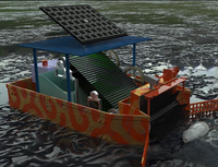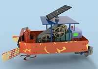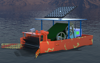 为解决以上问题,设计了一种具有太阳能环保系统且安全性高、劳动强度低、专门针对湖泊、池塘以及城市河道等场所使用的环保型水草及水面垃圾清理船执行机构。水面清理船由螺旋桨推进器、船体、接收装置、清理辊与输送装置等构成,为实现连续工作,船体采取单体式船体,具有排水量大、吃水深度小等优点。为了在满足浮力的同时降低阻力,由于水上作业对船速要求不高,船头以及船尾全采取援型结构船体前端设置,垃圾收集装置.船体中间为集物舱体,可以降低重心,船体尾部设置48V锂电池以及用于推进转向的控制中心,设置了太阳能极板来完成蓄电池电源的补充,实现了绿色环保。