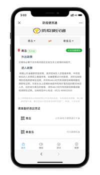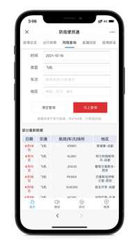 1. 在出行政策页面、同程查询页面中,用户可以通过输入出行地、目的地后,系统会实时的导入当前两地的出行政策及进出凭证为用户减免不必要的麻烦。用户还可以通过输入行程信息看到新冠肺炎接触者的行程:飞机、火车、高铁、大巴等交通工具均可以查询到。