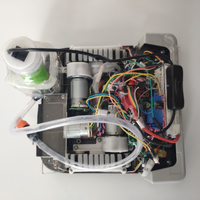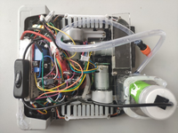 (1)应用领域和技术原理、用途:本作品适用于高楼上玻璃的清洁,采用真空抽气泵作为吸附方式,能够自主的完成避障,也可通过红外遥控进行控制,通过遥控控制移动和喷淋。喷淋系统由12V直流微型电动抽水泵、80*70*60mm长方体水箱、可调节雾化喷头构成,微型电动抽水泵将水箱里储存的液体通过软管从可调节雾化喷头喷出并将液体雾化,雾滴细密均匀,范围直径2~3米。喷水完毕后通过自身装备的刮水装置将水刮去,并用悬浮清洁布将玻璃擦净。