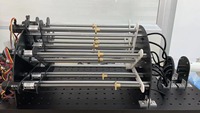 智能柔性机械臂如上图所示,包括旋转式快换机构(由旋转机架组、电机传动组、导绳滑轮组三部分组成)、柔性机械臂杆件组、角度传感器组、拉力传感器组。旋转式快换机构的旋转约束杆穿过旋转摆动杆的安装孔和旋转固定圆盘的安装孔,约束旋转摆动杆的旋转运动。通过导绳滑轮组约束绳索走向,避免绳索与旋转机架组干涉;通过脱出旋转固定圆盘的旋转约束杆,旋转摆动杆的转动将带动电机传动组的位置变化,增大旋转式快换机构内部零件的更换空间,方便导绳滑轮组和电机传动组的拆装;分别通过角度传感器组和拉力传感器组反馈万向节角度及绳索拉力实现系统闭环控制,该结构已申请发明专利。
