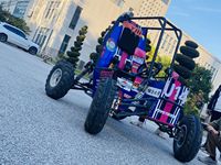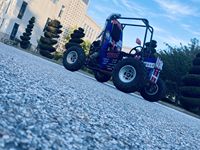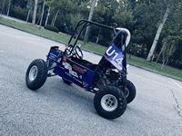 前悬架需较大的横向刚度及支撑力,根据双横臂悬架横向刚度高,侧向支撑 好的特点,将其运用于前悬架,以达到减少侧倾,提高弯道侧向支撑力,提高过弯速度的目的, 根据前悬架制动抗纵倾分析,将上下悬架摆臂设计为上下轴心平行,以保证减震器充分发挥作用; 后悬架因需要布置发动机减速器等部件,且由于球笼、半轴等活动限制需主销内倾角及轮距变动 尽量小,结合拖曳臂占用空间小,重量轻,跳动时参数变化小的特点,后悬架采用该形式。确定基本参数:根据悬架前轮轮距 1200mm 的设计,为保证车辆转向灵活性,后轮距需小于前 轮距,相差范围为 10—50mm,初步折中确定后轮距为 1175mm;为尽量减小转向半径,结合发动 机减速器布置所大致需要的空间,初步确定轴距为 1500mm;转向机的选择需考虑因主销内倾角 及主销后倾角带来的转向回正力所造成的在转动方向盘时车手的施力情况,结合比赛时长时间驾 驶时应尽可能减小车手转动方向盘时所施加的力以达到减少体力损失的目的,初步选择转向机长 度为 370mm,转向机行程为 100mm(左右各 50mm),转动圈数为 1.25 圈。 根据以上数据,初步建立转向系统上视线框图。根据阿克曼转角原理,通过平面四杆机构使 内侧轮胎转动角大于外侧轮胎转动角,从而使内外侧转动圆心近似同一点,内外侧车轮皆为纯滚 动状态,减少磨损。在用 SOLIDWORKS 三维建模之后,将建好的踏板三维模型导入 ANSYS 中进行实车制动时的一 个瞬间受力分析,在平台建立静力学分析模块,项目中导入制动踏板的有限元模型,进行自由网 格划分,单位选择为是(mm,t,N,s,mv,mA),接下来工程数据里材料属性设置为 1020 钢材 料对踏板与平衡杆连接处施加一个 2000N 的力,在中间定位孔处施加一个转动约束,边界约束条 件确定好了之后,模拟人的脚去踩踏板,在踏板上施加一个约 400N 的力,正常情况下脚掌发出 的力约为 400N,在导航项中添加求解结果,显示变形和应力,刹车踏板在 2000N 的极限工况下,应力集中区域在踏板的与脚掌接触面上,最大应力值远远 低于材料的屈服强度,不会对踏板结构产生破坏,在安装平衡杆的一端形变量是 0.001mm,完全 可以忽略,保证了踏板与平衡杆的装配精度,可以使得平衡杆处于一个正常的工作环境,不会因 为踏板变形而失效。发动机功率经 CVT、减速器、半轴传至轮胎输出。CVT 传动系统由一个主动轮、一个从动轮 和一条皮带,主从动轮各由两个椎形盘组成 V 形结构,为达到更大的扭矩和极限速度,设计 CVT 最小传动比为 3,最大传动比为 0.43。减速器为一个二级齿轮减速器,为达到更大的扭矩和极限 速度传动比为 12 。半轴直径为 20mm,有 4 个球笼式等速万向节,半轴直线性良好,动态平衡实 验表现良好。根据悬架对于离地间隙的设定,在考虑轻量化的前提下,选择尺寸半径为 10 英寸、宽度为 5 英寸的铸造铝合金轮毂,轮芯与轮毂的连接部分充当轮毂辐条以减轻簧下质量,偏距选择 2/5 以在轮毂尺寸较小的情况下充分为制动卡钳及制动盘的布置留下空间;轮胎的选择需充分考虑比 赛路况,花纹应尽量增加轮胎在沙石路面的抓地力,扁平比较大以减少落地冲击,选择尺寸为 22×7-10 的全地形轮胎以满足以上需求,胎压设定为 2.4bar,满足国标对于标准型轮胎的胎压 要求。采用桁架式车身既可以获得更低的车重,获取更强的加速性能,又可以满足高强 度的需求。