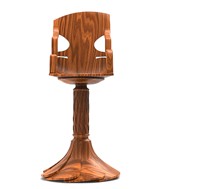 底座不同于一般的椅子,做了旋转花纹的柱体,与地面接触的地方做成了类似喇叭的形状,从底面看像似留声机,使其与平常吧台的椅子既有相似之处也有不同之感。又在两侧加了扶手,运用了多重元素,可能乍一看会很不搭,但仔细欣赏却不然,每一个部件都有衔接,变化又统一,有矛盾与和谐的美感。