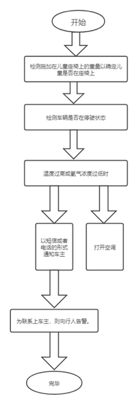 本作品提供一种儿童座椅控制装置,包括:压力传感器、运动传感器、氧气浓度检测仪、温度传感器、告警器以及处理模块;其中,压力传感器用于检测施加在儿童座椅上的重量并输出重量信号以确定是否有儿童在儿童座椅上;运动传感器用于检测车辆是否处在行驶状态并输出运动信号;告警器用于向用户告警;处理模块,与压力传感器、运动传感器、告警器相连接,用于如果根据压力传感器输出的重量信号判断有无儿童在儿童座椅上、根据运动传感器确定车辆处在停驶状态时,温度超标或者氧气浓度低于正常水平时向车主预警。