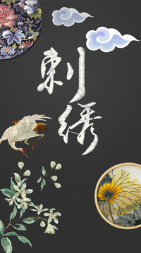 我的作品中心部分以白色刺绣二字居中,简单,淳朴,上方由四分之一刺绣作品和俩朵云朵插画布局,左面中间部分有一只仙鹤在飞翔,左面下部分有一株绿色植被,象征着刺绣文化的勃勃生机,右边下半部分是一个蒲扇的刺绣作品。