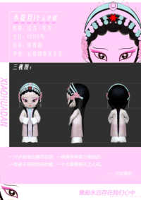 在小花旦的眼睛设计上为她选定了作为中式美特色之一、极具东方美感的丹凤眼型,让小花旦更具有东方特色;在眼影形态方面则参考了河南豫剧中的花旦形象,对其进行了一个稍微的改变和创作;眉毛形状上则为其选用了也是作为中国美特色之一的柳叶眉,但同时为了表现小花旦不气馁不服输的坚强个性,为她设计了一个上扬的眉尾;在发饰方面一部分参考了豫剧中花旦的形象,另一部分根据小花旦的年龄和其本人的性格去设定,为其添加了一些流苏和珠宝,以此突出小花旦周身洋溢着的青春气息,同时让小花旦的五官更为灵动;在衣服的花纹和图案方面采用了双色结合的方法对其进行了创新设计,并绘制了一些酷似藤蔓的花纹,寓意着生生不息,万代绵长,象征着河南豫剧蓬勃不息的发展历程;在作品背景颜色上提取了角色设计中既有的色调,与之相呼应。在排版文字上选择了方正姚体,因其结合黑体的刚劲、扁平和宋体的规整、简洁,能更有力的通过文字表达情绪。