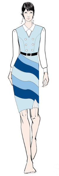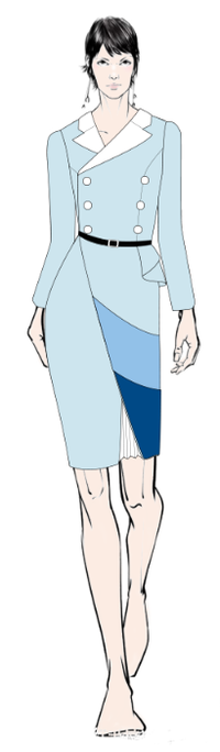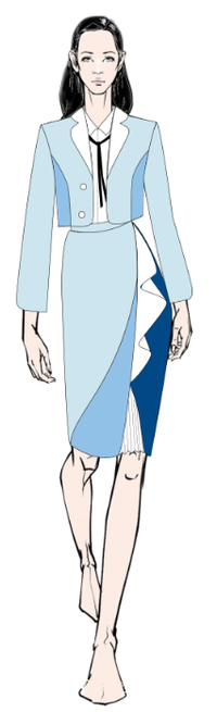 女人如水,可柔可刚,可以是绿野山林中哺育万物的涓涓细流,也可以是裹挟着强大能量的万丈高浪。上善若水,水善利万物而不争,似水,不仅似其形态性质,更要似其内在本质。《若水》系列想展示出的就是这种本质,在职场中不沉溺于勾心斗角,而是脚踏实地干好自己的事情,他强任他强,清风拂山岗,始终保持一种淡定从容的气质。所以在款式设计上我们选择了简约大气的风格。工艺方面,我们采用了特殊的拼接手法,拼接部分的线条选择了顺滑的曲线,且与逐渐变深的三种蓝色结合形成渐变拼接,突出水和波浪的感觉,视觉上较为和谐舒适。在裙摆和裤口处,我们还采用了开叉百褶的设计元素,如同鱼的尾巴,也如同波浪,为服装增添艺术感。《若水》系列是我们对于职场女性的鼓励,也是自己对于未来职场之路的向往,我们希望每一位步入职场的女性都能够找到自己的方向并坚定不移地走下去。
