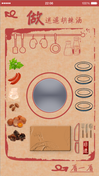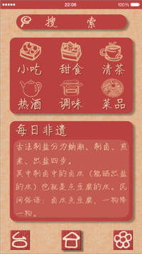 使用者在首页可以看到不同类别的非遗美食(非遗小吃、非遗甜食、非遗制茶、非遗制酒、非遗调味品、非遗菜品),选择自己感兴趣的类别进入后有此类别的各种美食,比如进入非遗小吃有逍遥胡辣汤、邵永丰麻饼、天津狗不理包子、太谷饼、周村烧饼、都一处烧麦、火宫殿臭豆腐、安琪广式月饼等等。点击进入美食之后就有相关的美食介绍,比如进入逍遥胡辣汤,后可以点击看胡辣汤的简介、食材或者做法。了解这些之后就可以制作了。这些可以实现使用者对中国非物质遗产关于美食、美酒等技艺的了解。