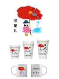 作品2是“撑花儿”,属于物品一类,指伞。同样以其名字展开视觉设计。整幅图画由一位小姑娘撑着一朵巨型花朵躲雨构成,其中的花元素也是以重庆市花山茶花为素材。取其名字表面意思以及物品实际作用,设计了本幅方言视觉作品。而产品运用我们主要运用到各式各类的杯子上,可以是分小、中、大的杯,也可以是马克杯。
