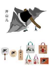 作品3是“开山儿”,属于物品一类,指斧头。我们将图画设计为一个小小的人儿,拿着一把巨大的斧头,想要劈开大山,也就是起名字的表面意思“开山”。同时以巨大的斧头为主体,是为了突出其实际意思“斧头”。因为这一方言视觉设计色调以黑灰为主,所以产品运用多以古风类物品为主,例如书签、扇子等。