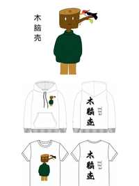 作品4是“木脑壳”,属于人物形象一类,含有多种意思:①木偶。②比喻头脑不灵活的人。③比喻受人支配的人。我们在进行视觉设计时,选择了将人物的头换成了木头,也就是突出“木脑壳”这一视觉形象, 并在树枝上画有一只啄木鸟,正在啄他的脑袋。同时将其眼睛画成空洞的状态,以此来突出人物形象的木讷,头脑不灵活。产品运用主要选取了日常的衣服,例如卫衣、T恤等,设计为正面图画,背面文字的形式。