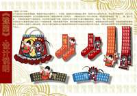 包包的设计主要是将包面打造成一个戏园的场景,将象形象置于园中,同时将象形象做成立体的形态,能够增加包包的立体感,包底悬挂着的是穆桂英头上所带的七星额子上面的绒球。其余袜子围巾被套的设计都是将河南的欲字与戏曲的经典形为作为结合,同时将象形象用立体的形态装饰在这些产品上。