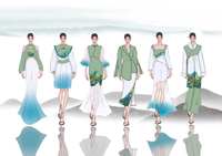 本次设计作品的主题名称为《宋雅》,该系列的设计灵感来源于非遗汝瓷和山水画,将汝瓷瓷器的青色色调与千里江山图结合起来,整体颜色为冷调的青色和白色,服装总体之间还穿插里千里江山画的局部细节图,整体的廓形多为X型H型,款式都是中式服装的改良款,保留了传统的盘扣工艺凸显精致,整个系列体现温婉的感觉。