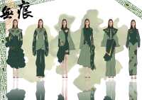 本次设计作品的主题名称为《无痕》,主题定位为非遗与新中式服装的融合,灵感来源于非物质文化遗产——剪纸,以荷叶上虫蛀出现的大小不一、形状各异的镂空结合非遗剪纸镂空艺术为设计灵感。根据荷叶的廓形及形态为切入点,将形状各异的镂空元素融入到服装设计当中,并采用了2023年春夏色彩流行趋势的颜色来通过对剪纸及新中式风的结合和碰撞从而得到了不一样的服装设计效果,在装饰工艺细节处理上先运用75D手抓花雪纺面料对镂空进行填充修补,然后再运用现代新行手工羊毛毡戳工艺的手法对形状各异的镂空边缘进行装饰,半透的雪纺加上立体的羊毛毡装饰使得镂空更加的细致美观。镂空的艺术是有痕的,服装的造型的裁剪是有痕的,地球生态的破坏是有痕的……镂空工艺的填充修补和装饰就像人们修复这个被破坏的地球一样,而服装就是这个“被破坏的地球”,因为被剪刀裁剪留下了大量的镂空痕迹,而服装又是一件完整的个体,所以需要进行填充修补并加以装饰继而得到了一系列完整又美观的设计,全过程都是有迹可寻的有痕,旨在用有痕来衬无痕以此来突出强调“无痕”这一主题。
