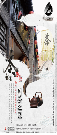 海报的设计理念 ;1.图文结合,文茂并序。茶字为主要位置使得海报的主题更加鲜明,通过对“茶”字那抹古色古香的配色,展现川茶制作技艺的悠久历史,十分形象准确的展现平面设计的真实性。背景采用奶白色的古卷的颜色,将历史的厚重感表现得淋漓尽致,海报的上端是一座茶楼的图片,符合了茶艺的宣传。海报的用字也是采用古典的样式,将古典的制茶技艺表现出来。介绍了制茶之道在川茶的体现,用少数的文字穿搭传达丰富的信息。