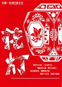 作品以剪纸和花灯为主题。整体运用红白两色,突出喜庆祥和的气息。花灯与主要文字,在表现方式上,皆采用了剪纸的风格,使二者在画面上形成呼应。海报底纹运用了中国传统纹样元素:祥云。角落的诗歌为描写,古时灯会的繁荣。