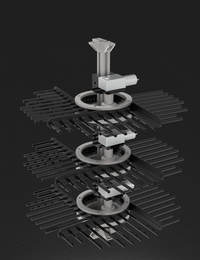 本团队创新设计了一种楼梯间行走爬升机械结构,具有调节重心位置和支撑位置的功能,可在楼梯间上下和窄小空间转弯掉头,大大提高了配送机器人社区环境的适应能力,真正实现无接触式送货上门。配送机器人的货物厢柜是式机器人运输过程中装载货物的载体,其设计结构在很大程度上对机器人配送量与安全性能都有较大影响。本作品一改传统的多舱门货箱结构,创新设计了多层旋转梳齿式全自动存取货物架,该设计使得货物存放容量大且存放合理,取货装置结构紧凑且取件口单一,便于控制和方便取货后的自我消杀,保证了货物的安全性同时便于防疫。