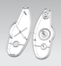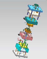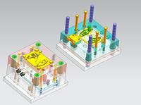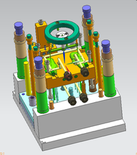 综合考虑各方面因素,完成一幅修正带外壳注塑模具三维结构图,并将3D模具结构图转化生成二维装配图和各主要零件图。