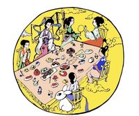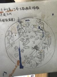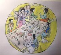 以手绘插画的形式,画出传统的神话故事“嫦娥奔月”,画中最中心位置便是嫦娥,画中想要展现的寓意是团圆,想象着嫦娥和家人在月亮上团圆,一起过节,月亮上的宴会,所以名字叫月宴。
