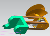 以降低重量、制造简单,成本低廉,安装方便、安全为目标,将改进的摆臂、箱体、刮板、行走动力单元组成采煤机。采用空心骨架、电动推机、弯板链等方法设计采煤机构教学模型,从而满足教学需求。 采用空心骨架制作摆臂框架以降低重量,机头处使用减速电机驱动切割部旋转,使用电动推杆代替液压缸调节摆臂结构的切割角度。内部中空用于布置行走动力单元及电气系统,以减速电机为驱动装置采用弯板链作为刮板链,其上等距安装刮板。
