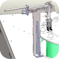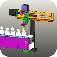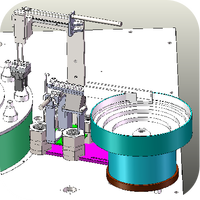 该转盘式组装工艺由旋转盘带动各工位工具,完成的各零件装配工作。该主盘为旋转盘,上面的小盘为副盘,在运动的过种中把多个小零件组装在一起,上料部分为输送带自动进料机械手夹取上料气缸式,灯壳的组装振动盘供料灯壳直振送料分料后夹取上料组装,灯钉的供料方式为振动盘送料,组装完成后由机械手夹取下料,夹取下料机械手为气缸组成带旋转掉头后放入出料输送带上,组装完成。