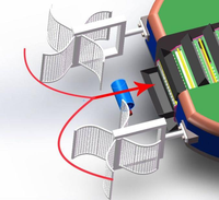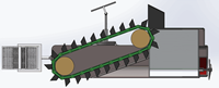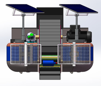 本装置采用太阳能混合发电及电动机混合动力带动前端页轮旋转,页轮将漂浮物卷入镂空链条,再通过链条镂空传动带把漂浮垃圾传输进垃圾仓内。 垃圾舱为抽拉式镂空设计,打捞机作业后可以直接将垃圾舱抽出对垃圾进行处理。