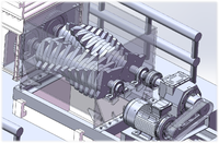 水草切割收集打包系统由切割装置、传送装置、切割装置、驱动装置以及打包装置构成。水草被高速齿轮刀片切割,通过倾斜筛板至螺旋刀片,螺旋刀片由电机带动进行水草切割,被切割后的水草被压缩气缸压缩成型后通过下料斗到达负压力气泵上的垃圾袋里,而后打包落至输送带。