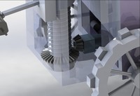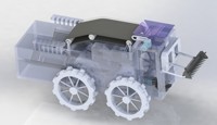 该产品由采掘、清洗、装箱三大功能组成。机器向前行驶过程,铲板将莲藕从淤泥铲起,铲板则由气缸带动向上运动,莲藕沿着倾斜的铲板滚动至升降板中,随后齿轮开始转动从而带动丝杆转动,升降板也随之上升,上升至一定高度后,升降板前半部分则会被挡块阻挡,升降板倾斜到一定角度后,莲藕落入收集框中,收集一定数量的莲藕后,翻转机构和推举机构开始工作,电机驱动丝杆转动从而使推杆上升,推杆也随之将收集框推送翻转,翻转机构则会辅助收集框翻转,使收集框能够水平翻转90°,莲藕掉落在传送板上,通过传送板莲藕就会被送至清洗装置中,V型毛刷和淋浴喷头开始工作,莲藕会随着V型毛刷一起转动,能够将莲藕每个部分清洗干净。