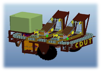我们的产品可以实现三行同步移栽,提高效率,实现行距可调。将旱地移栽就分解成自动分苗系统、输苗系统、移栽系统、镇压浇水系统、动力系统五大模块,并逐步完成结构设计、三维建模、组装成形以及运动仿真。最终,以实现拖拉机拖拽前进,盘钵自动分苗上秧,秧苗零速差入土,秧苗种植深度、行距、株距可调,苗距稳定不受车速影响、覆土与间歇性浇水等功能。设计了二十余种机构,包括自动分苗系统中的夹苗装置、盘钵进给机构、长行程往复运动机构、提苗机构、输苗系统中的间歇输苗机构、间歇出苗机构、移栽系统中的“零”速移栽机构、鸭嘴自动开口机构、动力系统中的变速机构、镇压机构、间歇浇水机构,镇压轮调节机构等。还具有不完全齿轮箱,创意十足,稳定可靠。简洁有效的实现株距调节可拆卸式盘钵分苗系统,结构新颖,简洁有效。可控镇压、浇水机构,联合作业能力更强,适应性更强,性价比更高车轮动力源,节约资源,移栽更稳定。