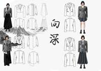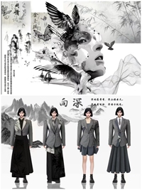 《向深》系列作品灵感来源于竹代表的坚韧谦逊的高洁品质,其内涵已然形成中华民族品格和精神象征,把竹文化与现代职场装结合,以竹点缀服装意在各大职场风气愈来愈好。款式与风格上与新中式结合,包含职场装的严谨肃然,但削弱了纯西装的呆板,让人眼前一亮。竹有节节高升的寓意,希望其蓬勃向上的身姿可以激励各位参赛者与大学生永不言弃,取“向”表方向,“深”表程度,作品名字寓意:心怀梦想,持续耕耘,脚踏实地,笃定前行。在此祝程似锦,事业大成。