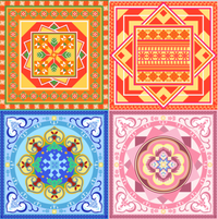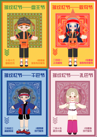 本次文创设计灵感来源于广东省清远市连南过山瑶瑶族,提取了过山瑶瑶族具有象征性代表的一些纹样(盘王印章形纹,大莲花形纹,八角花形纹,凤仙花形纹等)融合瑶族传统民俗节日(盘王节,敬鸟节,干巴节,扎巴节)的特色,两者互相结合的一种新式的纹样。搭配现代的表现形式和配色,以一种新的视角再现瑶族的传统纹样和传统节日。使用连续的方式围绕整个画面,使其更加具备传播性,丰富的色彩搭配使视觉冲击力更加饱满。在此进行了IP延展,在设计IP时,使用传统过山瑶瑶族服饰与现代服饰相互对应,起到瑶族服饰相互宣传的作用,增添IP形象文化语言。
