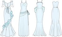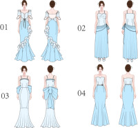 服装以蓝色为主,白色为辅,面料和装饰上采用了丝质缎料,加入立体贝壳与珍珠。礼服强调贝壳的纹理和波浪般的形状,包臀的设计。融合了西式与东方元素,打造出优雅、细腻、低调的晚礼服。