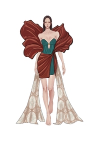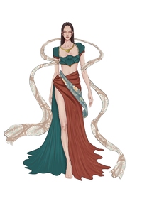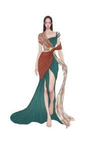 从敦煌壁画《佛像画·飞天》中的歌舞散花神,飘带、曲线美、披挂缠绕、轻盈飘逸、灵动自然等关键词,继而进行服装款式上的设计。