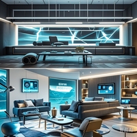 在构图方面,字符的分布看似随意却又有着一种内在的平衡。充满科技感的图片重复出现形成了一种节奏感,它们在画面中的位置分布既不显得过于密集也不过于松散,给人一种和谐的视觉感受。亮色氛围灯的出现打破了蓝色的单调重复,位于画面的一侧,起到了平衡画面重心的作用。数字 “7” 则独立于其他字符,以一种醒目的方式存在于画面中,吸引着观者的目光。激光色的位置相对较为低调,却又与其他字符相互呼应,共同构成了整个画面的有机整体。